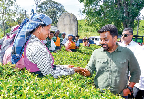 President Dissanayake engages in a lively discussion with a tea plucker during a stop at a tea estate en route to Nuwara Eliya on Wednesday